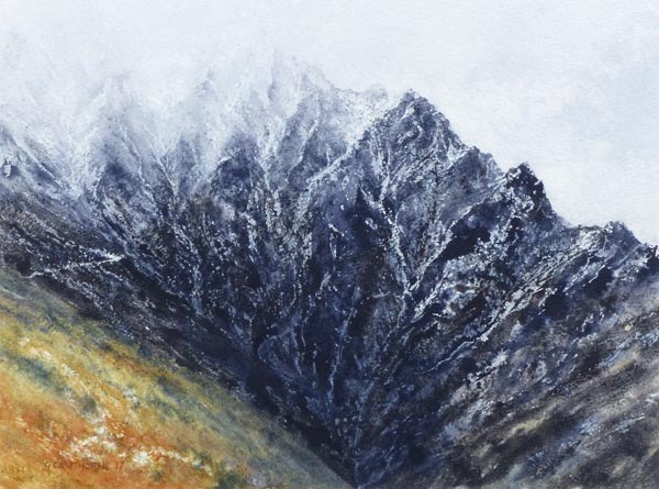 Watercolour painting of the southern slopes of Blencathra, wreathed in snow and cloud.