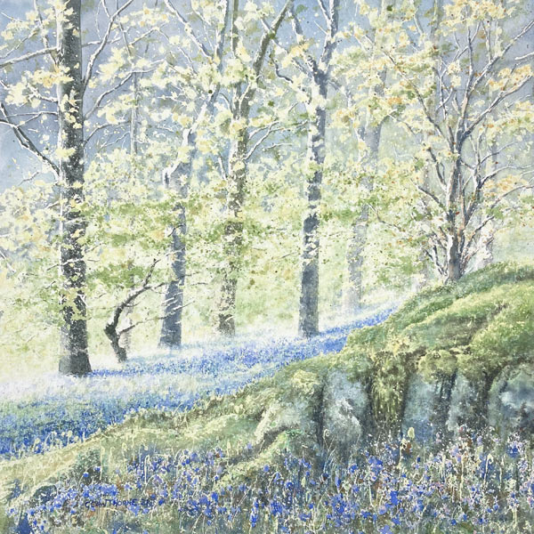 Watercolour painting of bluebells in woodland in Cumbria’s beautiful Borrowdale valley. 40 x 40cm. This painting was selected for the Lake Artists Society annual exhibition.