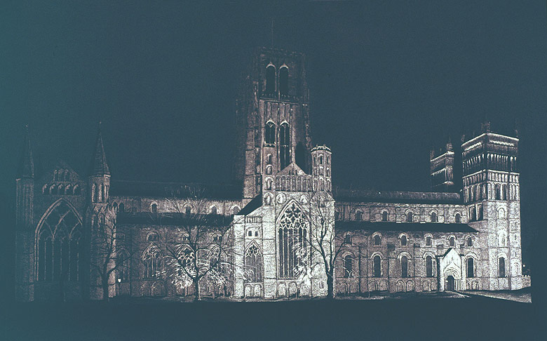 Nighttime view of the ghostly, floodlit cathedral with one or two buildings prised apart for a better view! Soft pastel on black paper. Size unframed: huge! 127 x 87cm. Please contact Gillie for price.