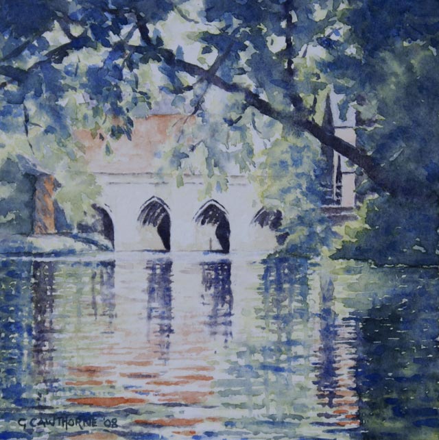 Watercolour on paper. View of Elvet Bridge from near Kingsgate Bridge in Durham. Size unframed: c.12 x 12cm. SOLD