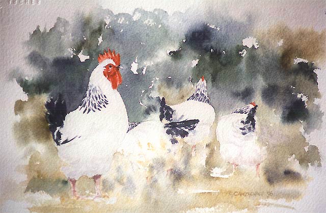 “Harem” Light Sussex cock and hens painted in watercolour. This old English breed is a very popular exhibition chicken. I love their smart plumage of white and black with irridescent blue and green highlights. Size unframed: c.30 x 20cm.