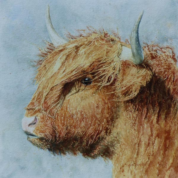 Cow from a pedigree herd of Highland Cattle in the North Pennines. Watercolour painting on Arches paper, 40 x 40 cm. Please contact Gillie for price.