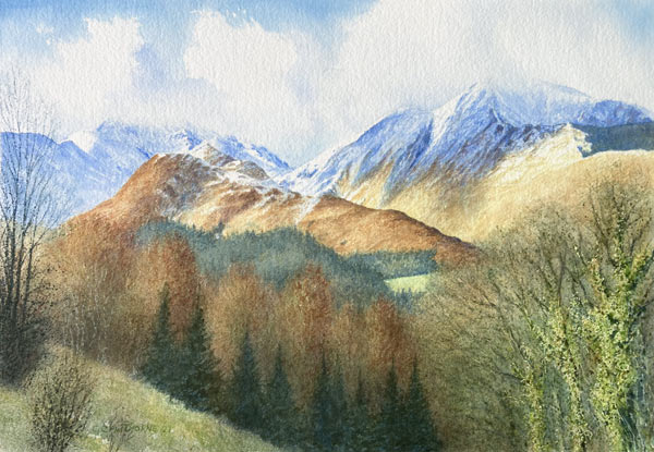 Watercolour painting on paper, of Grisedale Pike (right) with Barrow, Stile End, Causey Pike and Crag Hill. 45 x 30cm. Please contact Gillie for price.