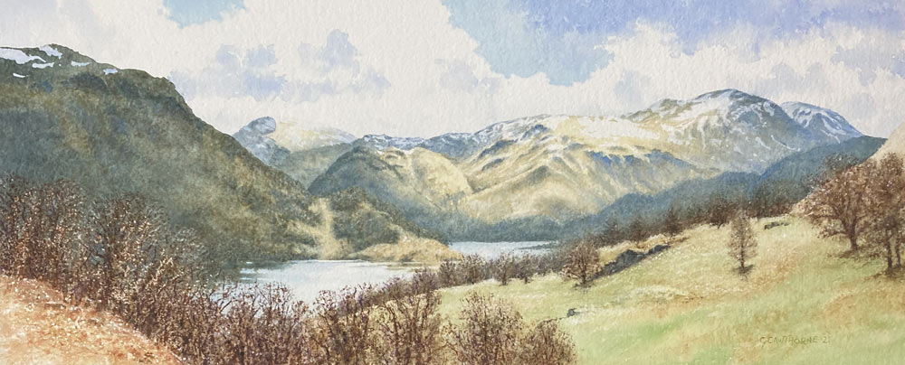 Winter sun shining on Silver Bay and Place Fell, seen from Gowbarrow Park. Gowbarrow is a delightful little fell, next to Ullswater with all the classic Lake District features one could ask for (including parking and tearoom at the stunning Aira Force). Watercolour on paper 50 x 20cm. Please contact Gillie for price.