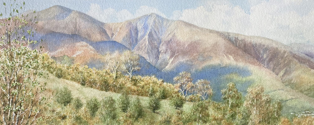 Skiddaw seen from the lower slopes of Grisedale Pike on a fine spring day – just enough cloud to be interesting, but not enough to threaten rain! A perfect Lakeland day. Watercolour painting on Arches Aquarelle paper, 45 x 15cm. Please contact Gillie for price.