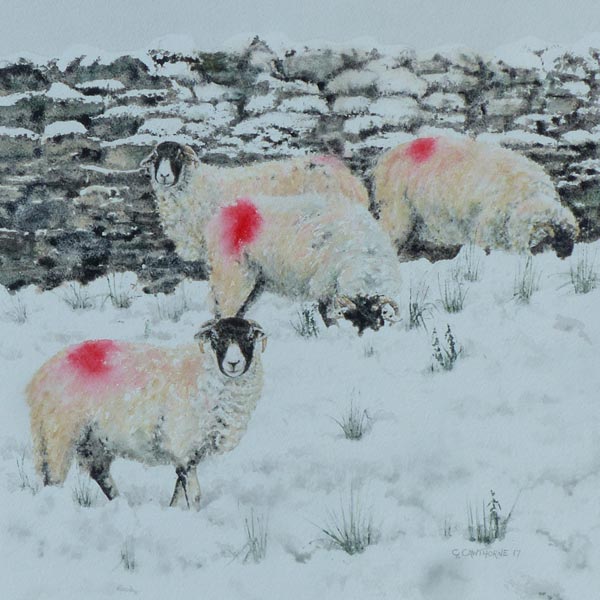 Hardy Pennine sheep shrug off the snow, sporting a stylish red owner’s mark. Watercolour on Arches paper 40 x 40cm. SOLD